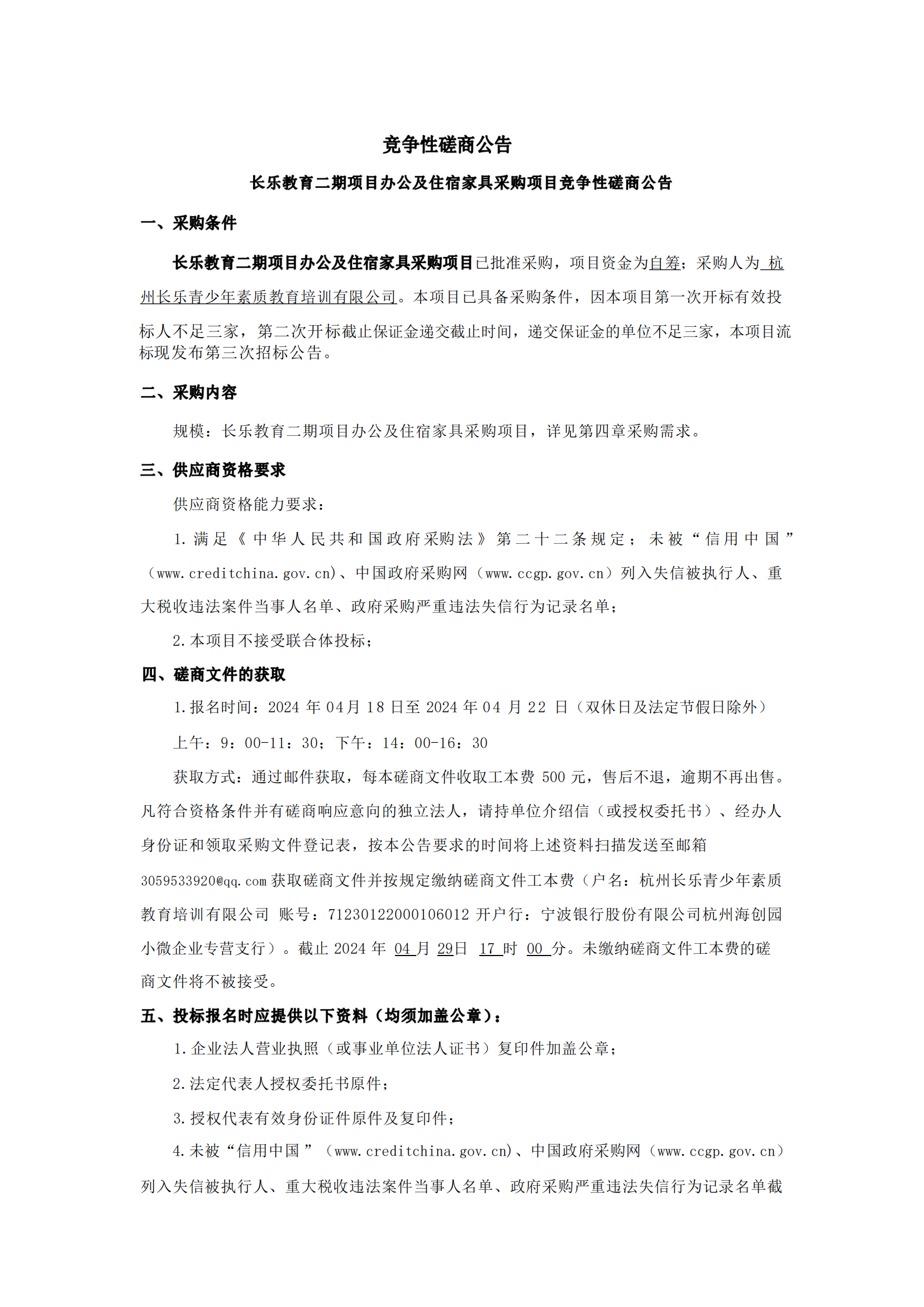 長樂教育第二期辦公及住宿家具采購項目競争性磋商公告